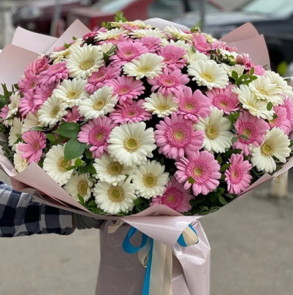 Букет из 101 белой и розовой герберой с добавлением зелени в стильной упаковке