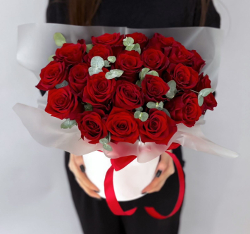 Коробка с красными розами и эвкалиптом